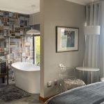 Sliding doors open onto an enclosed patio featuring an indoor braai and a hot tub, creating a sheltered space to relax throughout the year. Outside, guests can gather around the fire pit for evenings under the stars, while enjoying the quiet surroundings along the river.